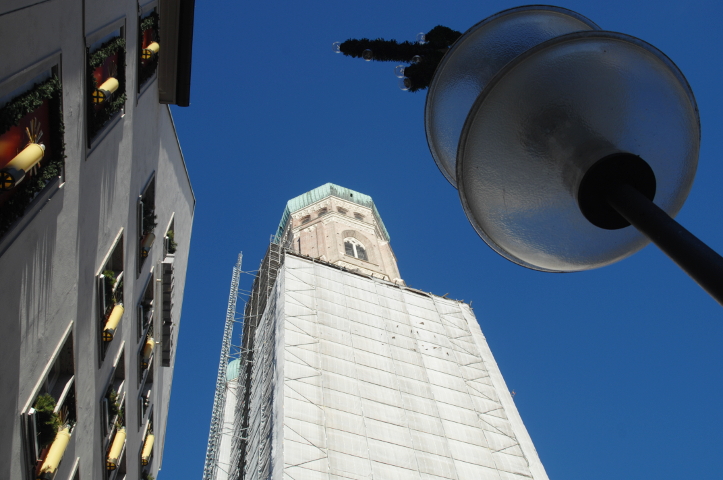 München. Am frühen Samstagmorgen dringen unbekannte Akteur_innen der „Identitären Bewegung“ (IB) in das Baugerüst an der Frauenkirche ein. Anschließend steigen sie die Treppe bis zu obersten Etage des Gerüsts am Nordturm hoch und entrollen von dort, in einer Höhe von rund 56 Metern, ein 12x12m großes Transparent zur Fußgängerzone in der Kaufingerstraße hin. Das selbstbemalte Plakat ist in den IB-typischen Farben gelb und schwarz gehalten und trägt die Aufschrift „Minga ist identitär! #Lederhosenrevolte“ sowie das von der extrem rechten Bewegung als Logo benutzte „Lambda im Kreis“.